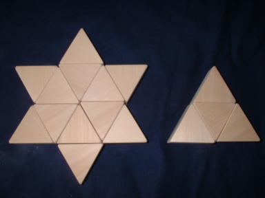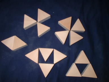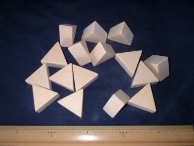 単なる三角形の積み木です。 いろいろな図形を作って遊べます。 遊び方は自由自在! 1辺 4センチ、 厚さ2センチ 材質 ヒバ 16ピースセットです。 個数など ご希望にお応えします。